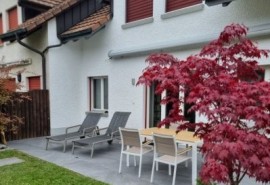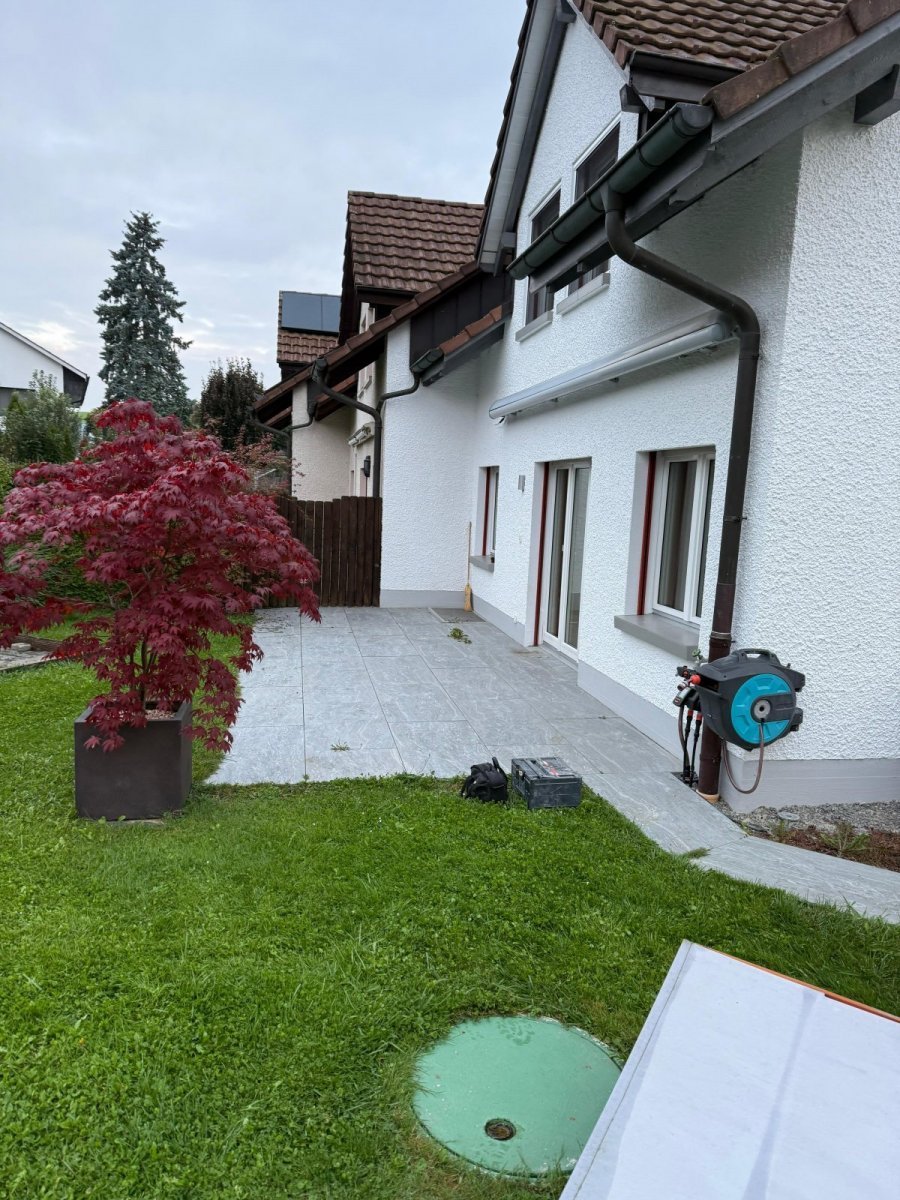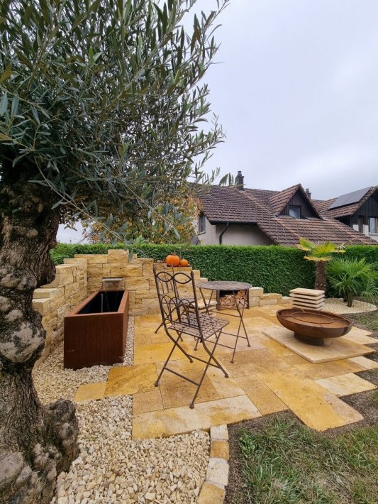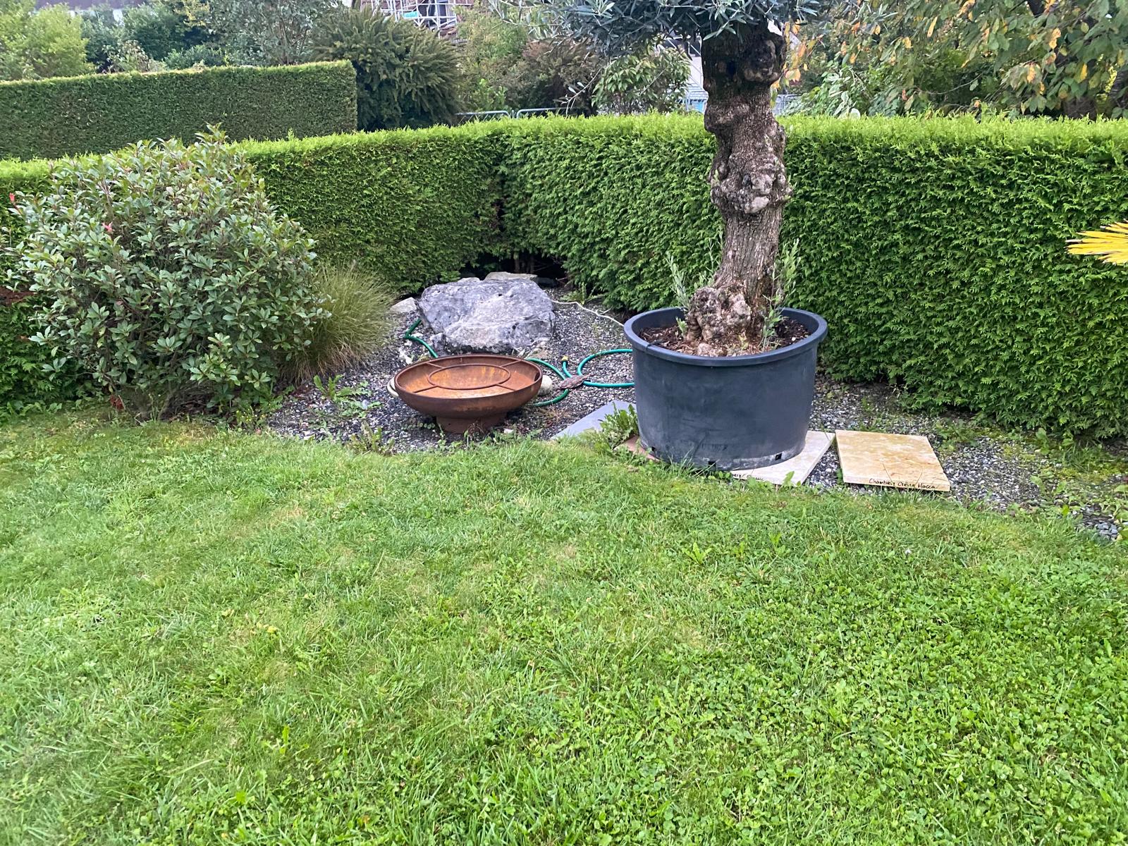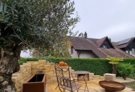 Ein besonderes Highlight ist die mediterran inspirierte Gartenecke. Warme Natursteine, ein stilvoll integrierter Brunnen und eine moderne Grillschüssel schaffen eine Atmosphäre wie im Süden. Dieser Bereich lädt zum Verweilen, Geniessen und Zusammensein ein.