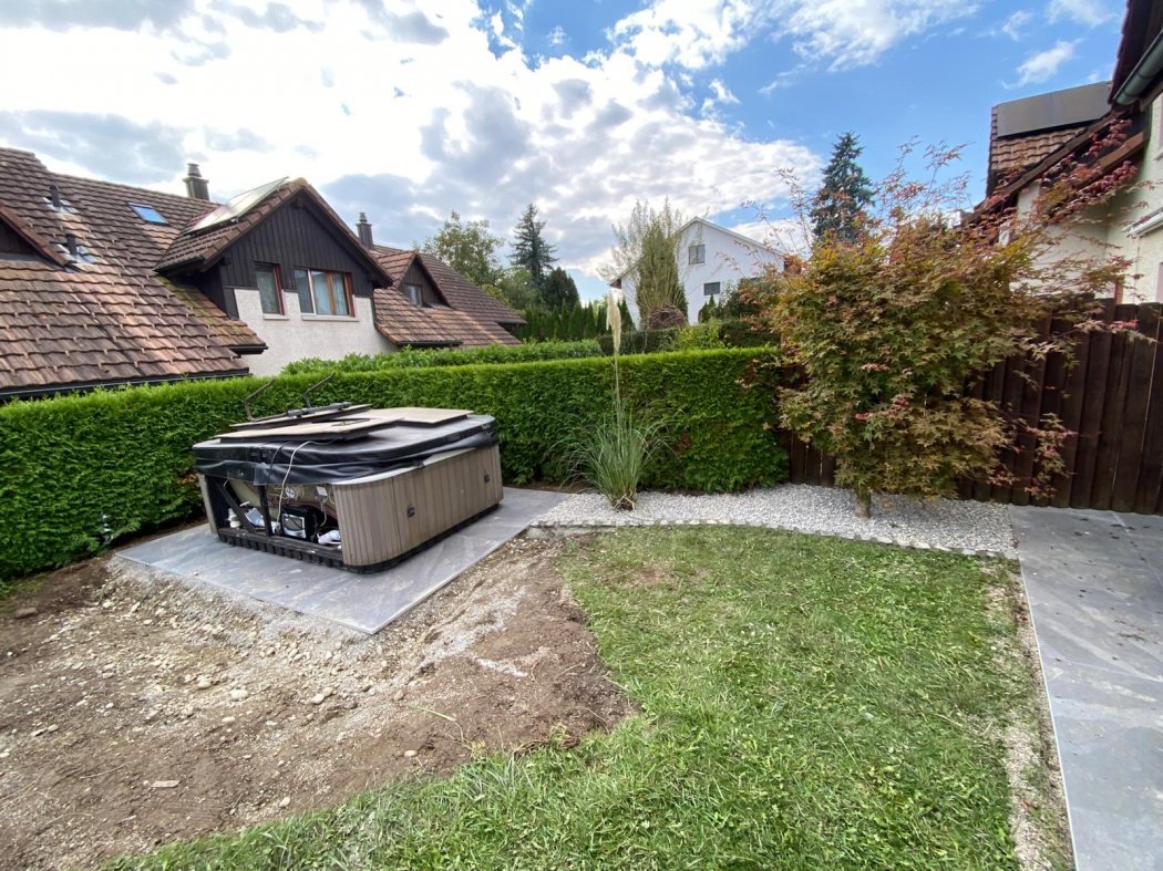 Ein eigens gestalteter Bereich für den Whirlpool bietet Privatsphäre und Entspannung. Die klare Linienführung der Terrasse bildet eine ruhige Basis und macht den Wellnessplatz zu einem geschützten Rückzugsort.